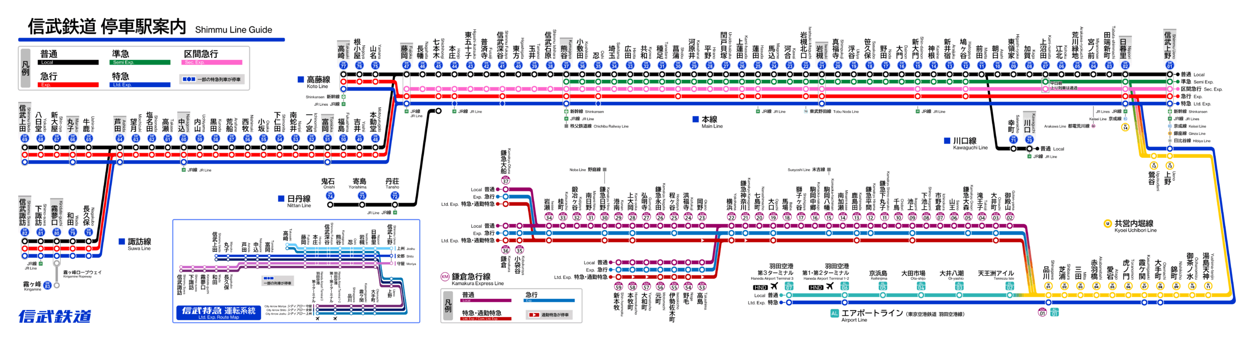 信武鉄道は,東京都・埼玉県・群馬県・長野県の一都三県に鉄道5路線,軌道3路線5系統,索道1路線を有する鉄道事業者である。共営地下鉄内堀線・東京空港鉄道・鎌倉急行電鉄との直通運転により,路線ネットワークは羽田空港・横浜・三浦半島まで広がる。