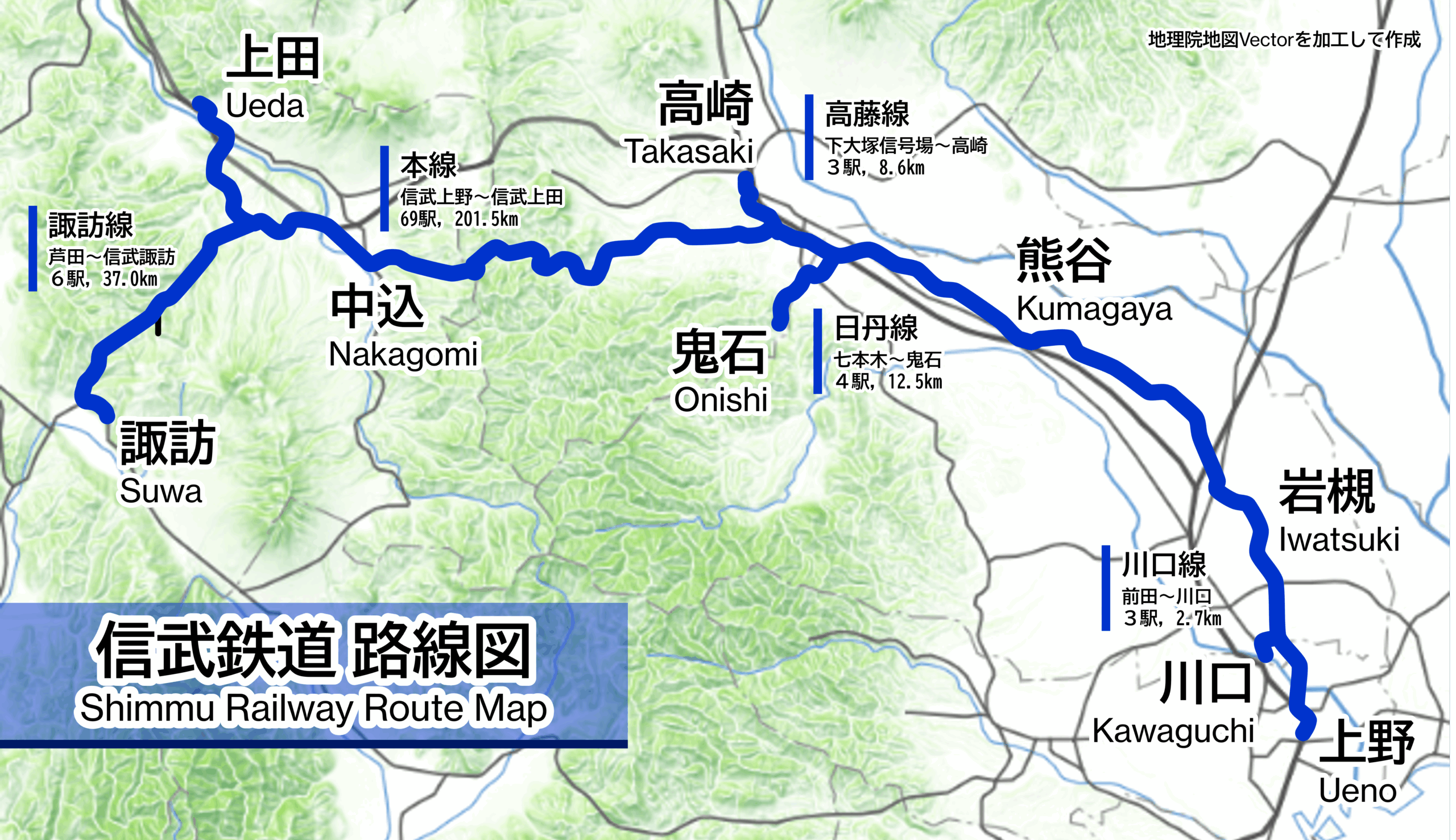 信武鉄道の骨格となる路線。営業キロ201.5kmは私鉄の一路線当たりの距離として最長。武州鉄道,上野鉄道(現上信電鉄),丸子鉄道の3社が絡んだ複雑な歴史を持つ。上野-藤岡は東京通勤圏であり,本数・両数ともに多い。日暮里-宮ノ前は下町の風情を残し,鳩ヶ谷-蓮田はベッドタウンの真ん中を走り,熊谷-藤岡は畑の中の長い直線区間を爆走する列車が見られたりと,風景は多様だ。藤岡を過ぎるとローカル色が一気に濃くなり,普通列車は毎時1本程度の運転,車両も2両のワンマンカーとなる。山岳路線を感じるループ線を抜けると長野県。最後は筑摩山地の麓を走り抜け,終点の上田に到着する。